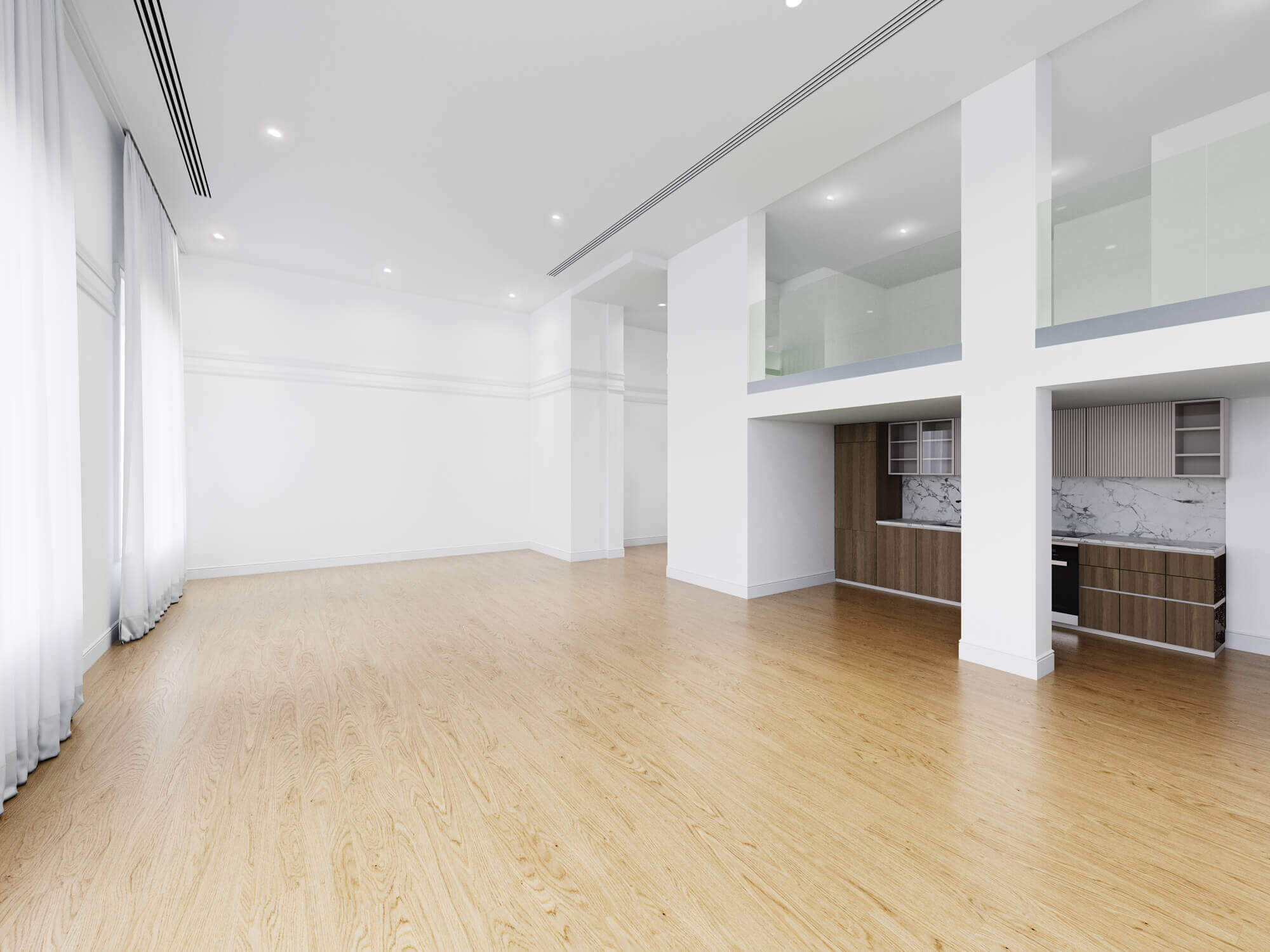 Vom geräumigen Entrée gelangt man zum großzügigen Wohnsalon mit einer offenen Küche und einem Essbereich sowie dem Aufgang zur Galerie, die sich perfekt als privater Arbeitsbereich oder zur Einrichtung einer Bibliothek anbietet. Zwei Schlafzimmer mit Bädern en Suite, ein Schrankraum, zwei Abstellräume und ein Gäste-WC komplettieren die Wohnung.